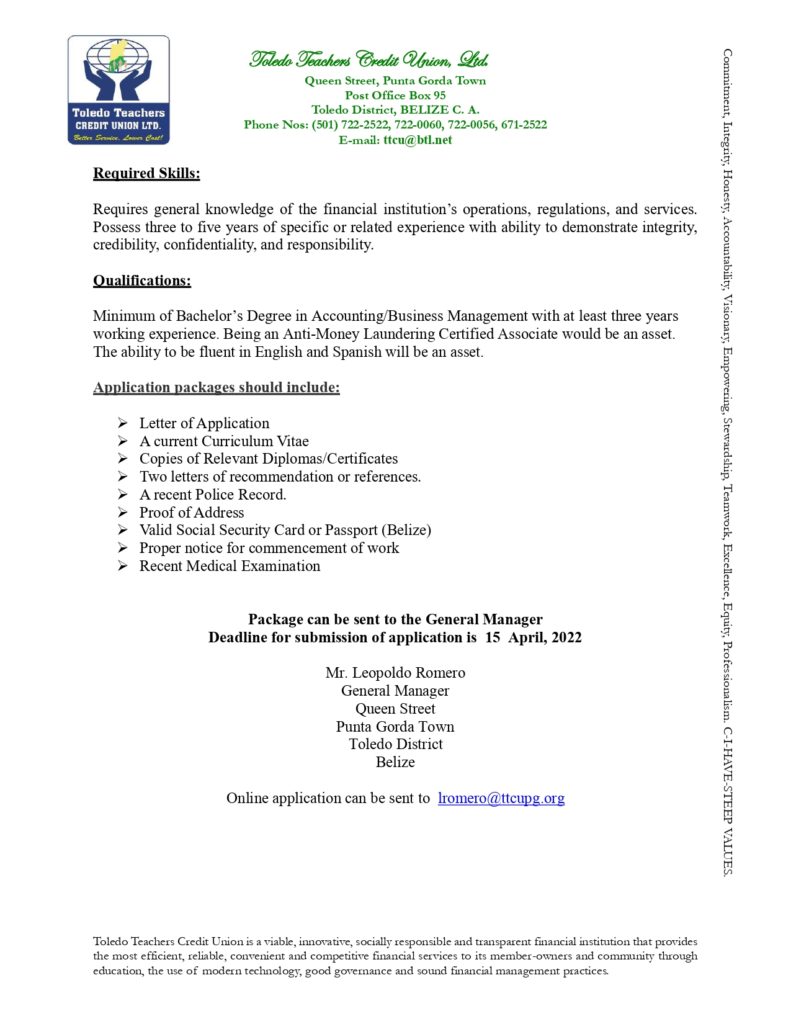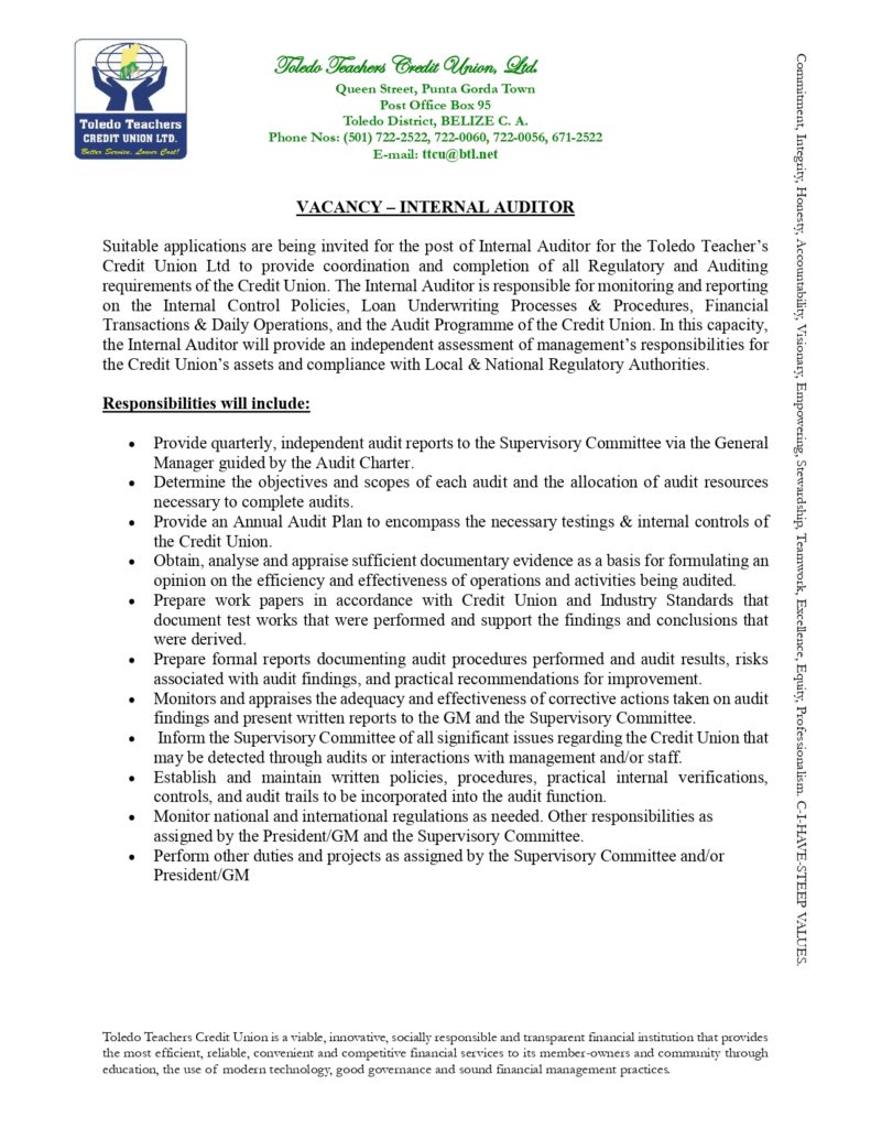 Suitable applications are being invited for the post of Internal Auditor for the Toledo Teachers Credit Union LTD. at our Main Office in Punta Gorda Town to provide coordination and completion of all Regulatory and Auditing requirements of the Credit Union. The Internal Auditor is responsible for monitoring and reporting on the Internal Control Policies, Loan Underwriting Processes & Procedures, Financial Transactions & Daily Operations, and the Audit Programme of the Credit Union. In this capacity, the Internal Auditor will provide an independent assessment of management’s responsibilities for the Credit Union’s assets and compliance with Local & National Regulatory Authorities.